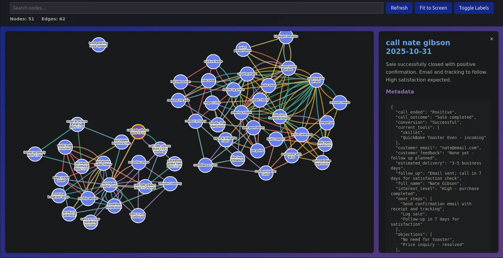 Logical Inference: The agent was able to create a separate HyperMemory attached to the specific chat session. It then performed logical inference by fusing the conversation memory (the live data) with its existing sales knowledge (the read-only procedural memory). This fusion allowed it to dynamically generate contextual rebuttals and adapt its strategy based on learned information.